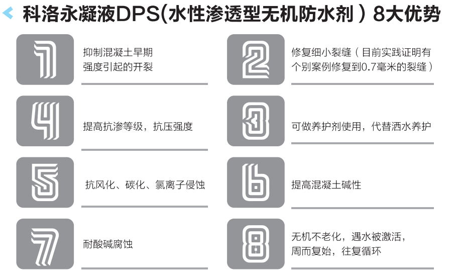 科洛水性渗透型无机防水剂是当今新型的绿色环保材料,不含甲醛,不含重金属,具有无毒、无味、不可燃、不挥发的特点,是一种透明的水溶液化合物。永凝液DPS是水溶性无机化合物,能自动渗入混凝土表层约30-40mm,使填料与混凝土基质在固化剂作用下发生硅化作用而牢固结成一体。其形成的硅氧键的网链结构类似天然晶体,即使在超过1000°C的热力下,依然抗热且不会龟裂,并且其涂膜具有像人体皮肤-样既不渗水又能排汗的透气功能,使基质保持干爽。同时无机矿物涂层的这种特殊结构,使其在大自然“热胀冷缩"往复循环运动中,能像岩石一样,长期保持涂膜表面的清洁,以阻止霉斑和苔藓的生长科洛永凝液DPS作为混凝土优良的保护剂,在很大程度.上减缓了混凝土碳化(中性化)和碱-骨料皮应(AAR)的速度,永久的阻止侵蚀性介质(如:氯化物)腐蚀。